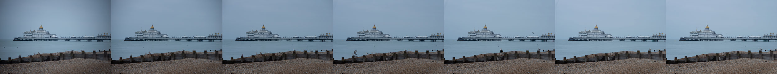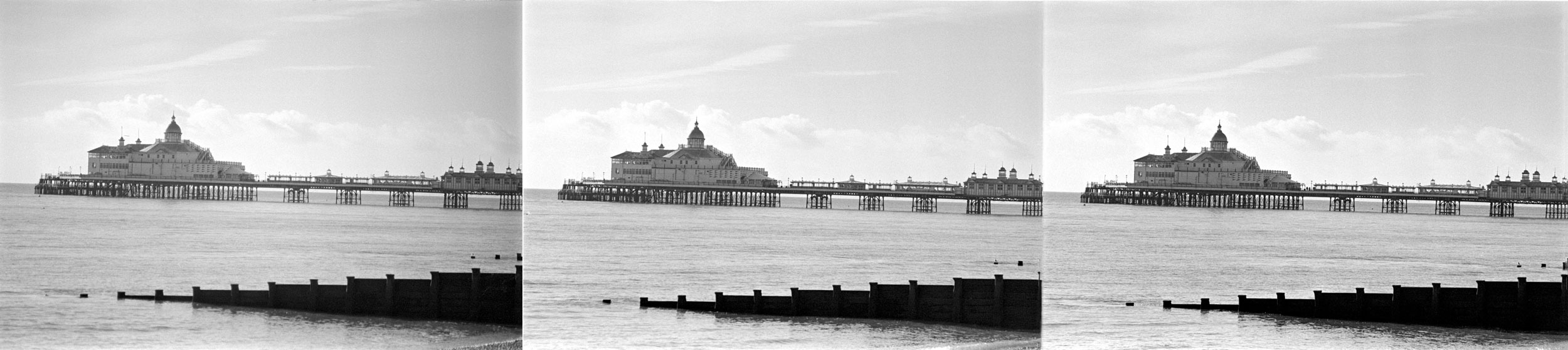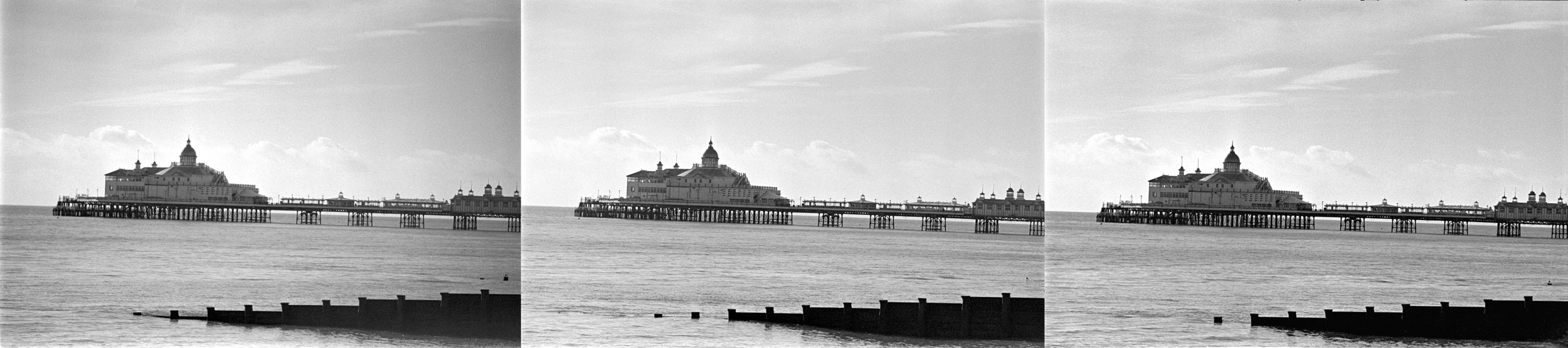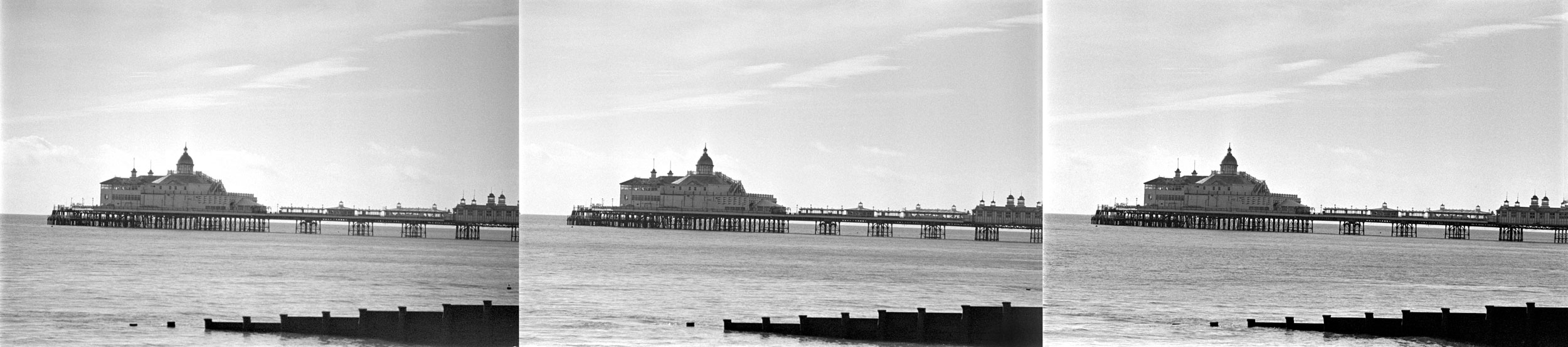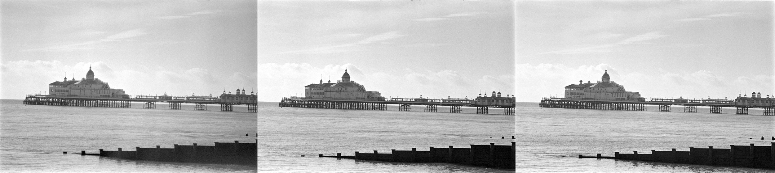 A series of exposures were made from f2.8 (f3.5 Soligor) to f22 and lenses were focused at infinity for the photographs of the pier, whilst the photographs of the breakwater exposure was made at f8 and the lens was focused on the third breakwater upright using focus confimation.