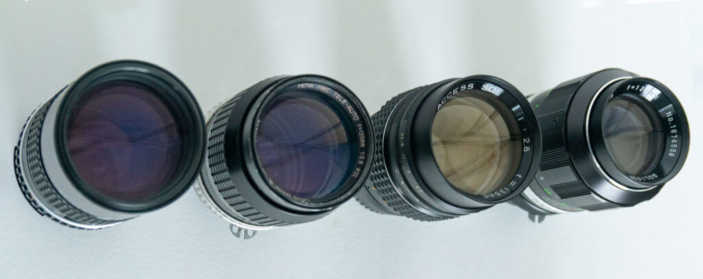 Lenses from left to right – Nikon 75-150mm, Vivitar 70-150mm, Kiron 70-150mm, Hoya 70-150mm